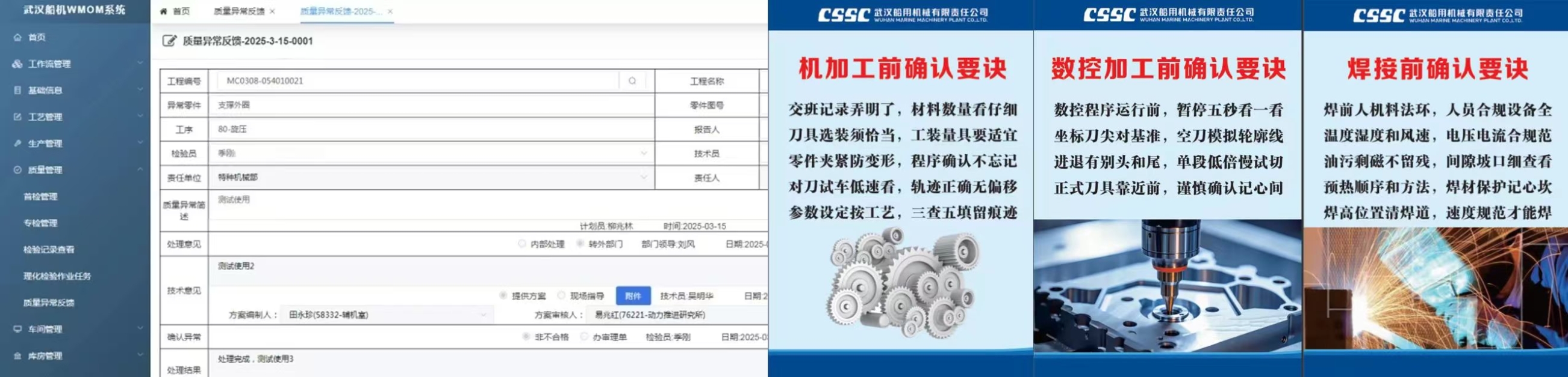 為進(jìn)一步提升生產(chǎn)管控水平,中船集團(tuán)武漢船機(jī)總結(jié)質(zhì)量管理好的經(jīng)驗(yàn)做法,以操作者為中心,探索新的管控手段,利用信息管理系統(tǒng)賦能,基于WMOM系統(tǒng)推出“確認(rèn)制、舉手制、推送制”功能。
