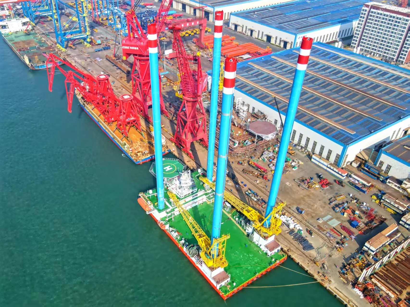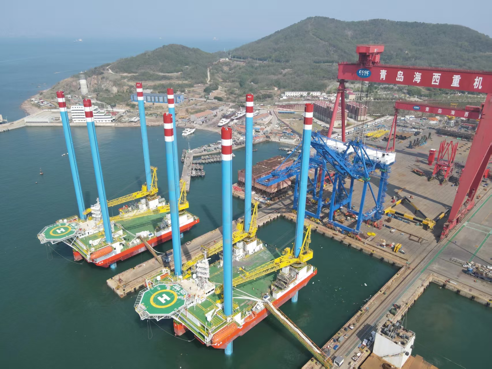 一聲歸航的汽笛響起,JANA 508平臺緩緩?fù)?吭谥写瘓F武漢船機旗下海西重機碼頭,標(biāo)志著近兩個月來由中船集團武漢船機總包建造的三座自升式海上作業(yè)支持平臺密集的試航任務(wù)圓滿結(jié)束。從空中鳥瞰,三座自升式海上作業(yè)支持平臺猶如三個鋼鐵巨人屹立在碼頭邊。